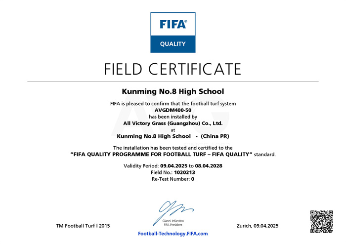 4月9日,经过国际足联FIFA指定的法国Labosport实验室的严苛验收,由傲胜人造草铺设的深昆明市第八中学足球场顺利通过国际足联FIFA足球场草坪质量检测,获得FIFA QUALITY 认证证书!